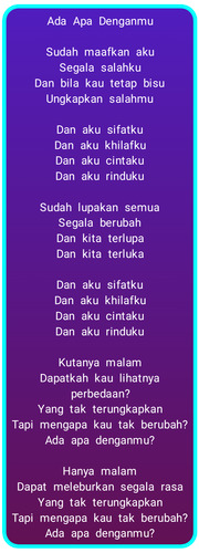 Dapatkan ia dimengerti jika tak ada spasi? Semua yang percaya kepadanya dijanjikan hidup kekal bersama dengan dia . Beri aku jalan yang indah. Masih ingatkah kau hei pembunuh asmara, saat kita tersenyum bersama dan kita selalu berangkulan bersama, meretakkan masalah. Ijinkan ku lepas penatku 'tuk sejenak lelap di bahumu.